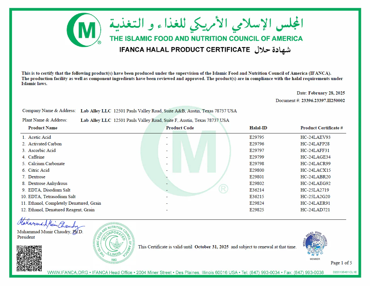 Due to growing concerns over food safety, the demand for Halal products is growing even among the non-Muslim community. Halal foods are often preferred for additional safety and quality control. Lab Alley is pleased to offer you our line of high-quality Halal chemicals you can trust.