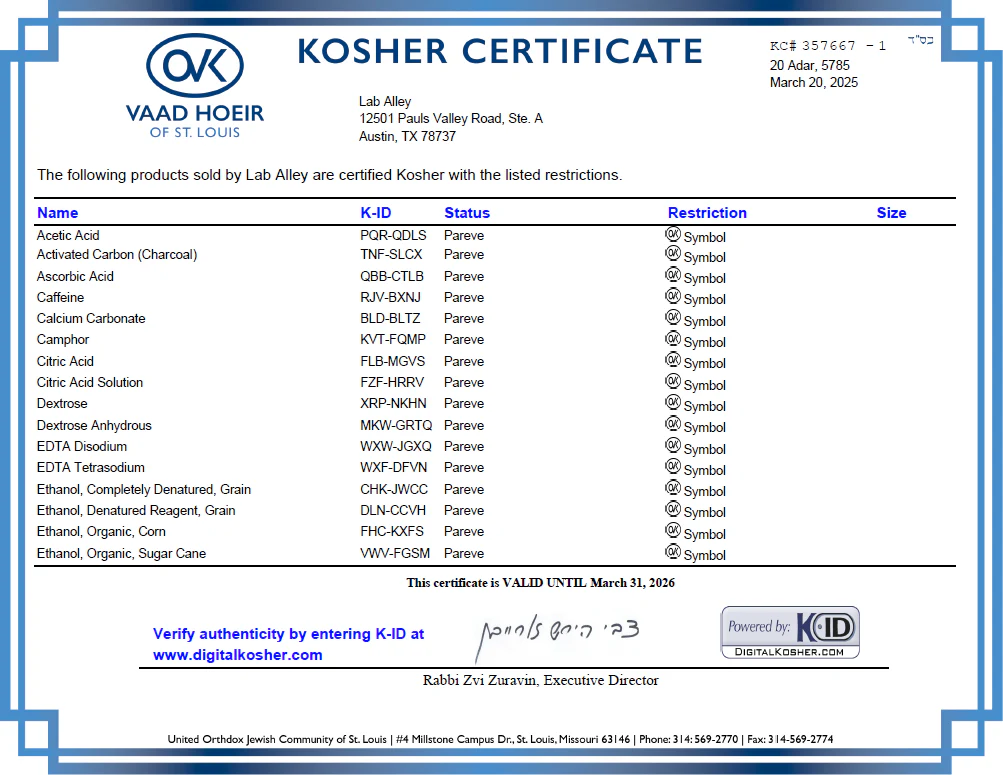 A rabbinic agency must approve the certification, verifying that no non-kosher substances are present. Lab Alley has received Kosher Certification under the supervision of the OV Kosher by the Vaad Hoeir of St. Louis.