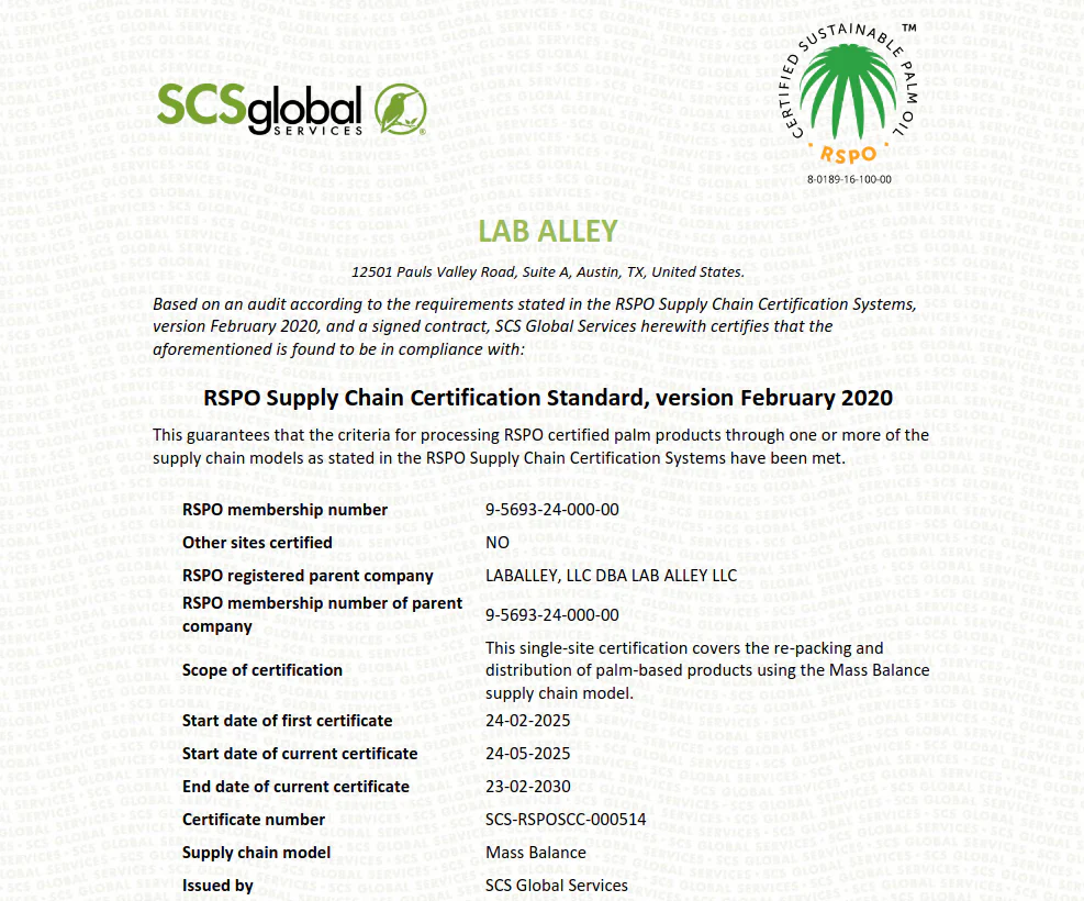 By achieving RSPO certification, Lab Alley supports a global movement to combat deforestation, protect biodiversity, and ensure fair labor practices while reinforcing its commitment to sustainability at every level of its operations.